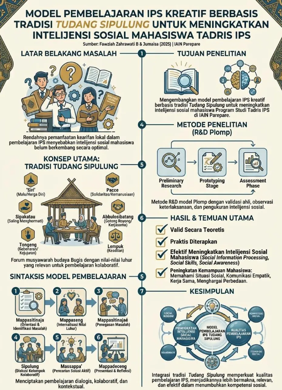 Dalam riset berjudul Enhancing Students' Social Intelligence through the Tudang Sipulung Learning Model yang dilakukan oleh Fawziah Zahrawati B, Jumaisa, Ease Arent, dan Andi Aras dari Institut Agama Islam Negeri Parepare dan Universitas Negeri Makassar, sebuah model pembelajaran inovatif diuji untuk menjawab tantangan ini. Penelitian ini secara khusus menyoroti efektivitas model pembelajaran Tudang Sipulung dalam meningkatkan kecerdasan sosial mahasiswa Program Studi Pendidikan Ilmu Pengetahuan Sosial di IAIN Parepare, mengintegrasikan kearifan lokal Bugis ke dalam kerangka akademik.