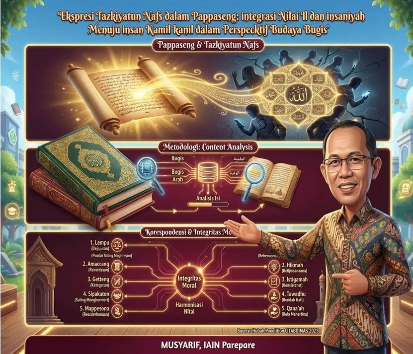 Dalam riset berjudul "HARMONY BETWEEN THE VALUES OF AND TAZKIYATUN NAFS IN BUGIS LONTARAK" yang dilakukan oleh Musyarif, Ahmad Yani, Fuadul Umam, Anugrah, dan Susi Mako, sebuah perspektif baru ditawarkan. Tim peneliti dari Institut Agama Islam Negeri Parepare ini secara komparatif menganalisis titik temu antara nilai-nilai luhur Bugis yang termaktub dalam manuskrip lontara dengan konsep tazkiyatun nafs, yaitu penyucian jiwa dalam Islam. Berbeda dengan studi sebelumnya yang cenderung memisahkan kedua ranah ini, riset ini mengkaji bagaimana etika Bugis dan spiritualitas Islam dapat saling melengkapi, membentuk identitas moral yang utuh.