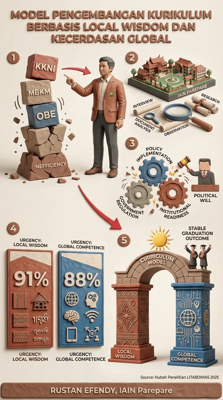 Model kurikulum yang diusulkan oleh Rustan Efendy dan timnya berupaya melampaui perubahan kebijakan temporer dengan berbasis pada kompetensi inti yang inheren dan berkelanjutan. Model ini mengintegrasikan kearifan lokal (melalui mindset budaya, tradisi tutur, dan praktik keseharian) dan kompetensi global (melalui literasi digital, kolaborasi internasional, dan berpikir kritis) sebagai pilar epistemik kurikulum yang stabil. Ini bukan sekadar penambahan konten, melainkan sintesis yang menghasilkan lulusan dengan identitas kuat sekaligus wawasan luas.