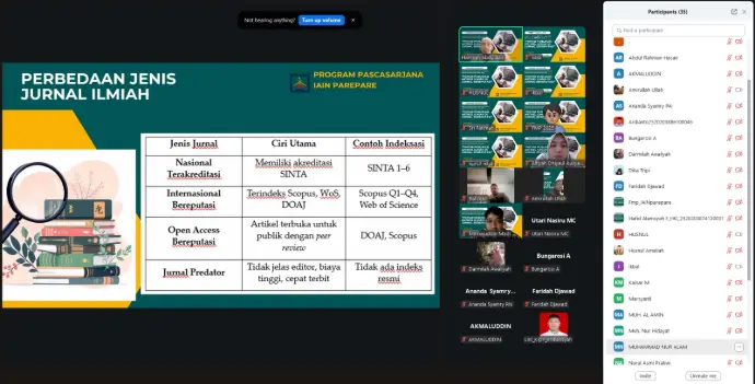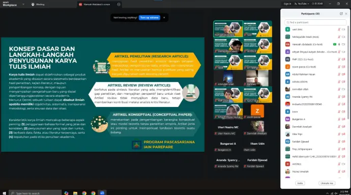 LP2M IAIN Parepare — Pascasarjana IAIN Parepare kembali menunjukkan komitmennya dalam meningkatkan budaya literasi akademik melalui pelaksanaan "Webinar dan Sosialisasi Buku Panduan Literasi Jurnalisasi Mahasiswa Magister Pendidikan Bahasa Arab", yang digelar pada Jumat sore, 17 Oktober 2025.