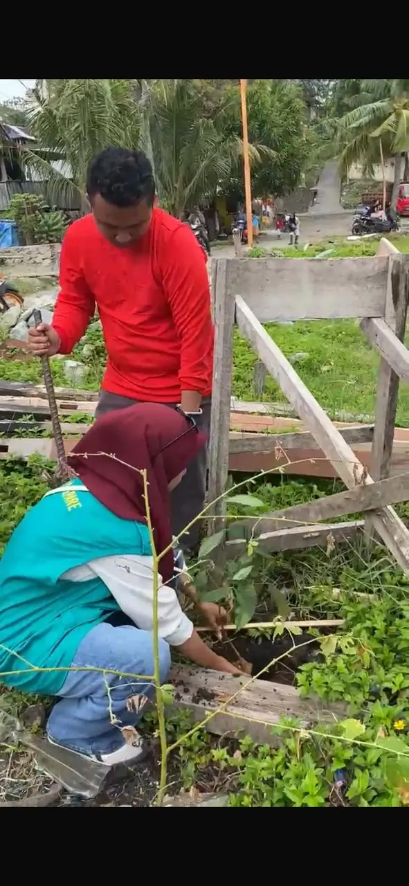 Di lokasi kegiatan, tampak seorang pria yang diduga warga setempat sedang menggali tanah untuk menanam bibit, sementara seorang mahasiswi KKN mengawasi proses penanaman. Interaksi sederhana tersebut mencerminkan eratnya hubungan antara mahasiswa dan masyarakat dalam mewujudkan tujuan bersama menjaga lingkungan.