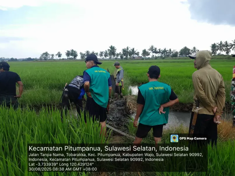 LP2M IAIN Parepare---Mahasiswa Kuliah Kerja Nyata (KKN) Mandiri IAIN Parepare Posko 20 bersama warga Kelurahan Tobarakka melaksanakan gotong royong perbaikan saluran irigasi di lingkungan Ading pada Sabtu, 30 Agustus 2025. Kegiatan ini digelar untuk meningkatkan kualitas fasilitas pertanian dan mendukung kelancaran pengairan sawah warga.