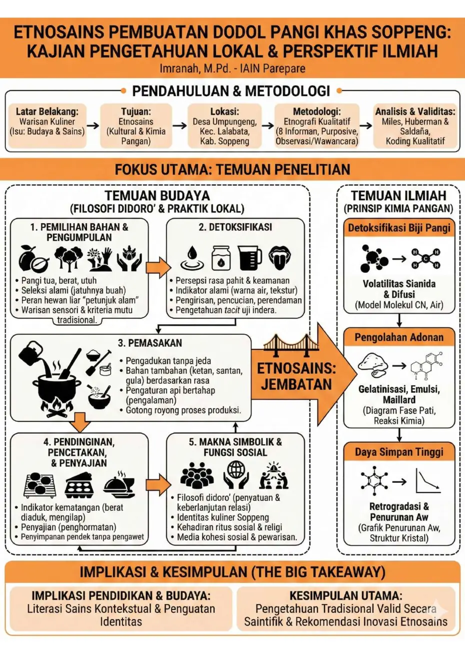 Dalam riset berjudul “Exploring Ethnoscience Through Dodol Pangi: Context-Based Learning in the Soppeng Community” yang dilakukan oleh Imranah Imranah, Andi Sitti Aisyah, dan Elvira Elvira, terungkap bagaimana proses pembuatan dodol pangi, kudapan khas dari Soppeng, Sulawesi Selatan, bisa menjadi lensa untuk memahami fenomena ilmiah kompleks. Penelitian ini secara sistematis menggali nilai-nilai saintifik yang tertanam dalam tradisi pembuatan dodol pangi, sebuah bentuk etnosains yang hidup di masyarakat.