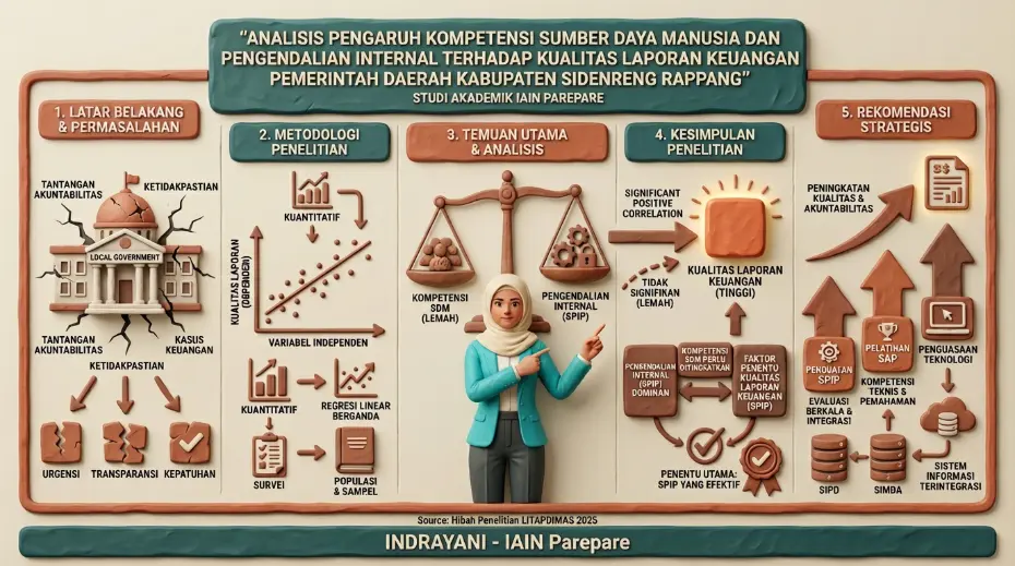 Dalam riset berjudul “From Individual Competence to Organizational Capability: Empirical Evidence on Internal Control Dominance in Local Government Financial Reporting Quality” yang dilakukan oleh Indrayani dan Rismala dari IAIN Parepare, terungkap temuan signifikan mengenai faktor-faktor penentu kualitas pelaporan keuangan di entitas pemerintah daerah, khususnya di Kabupaten Sidenreng Rappang. Studi ini menyoroti bagaimana kapabilitas sumber daya manusia dan mekanisme kontrol internal berinteraksi dalam membentuk integritas dan transparansi laporan keuangan.