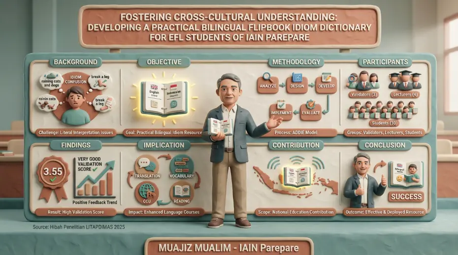 Dalam riset berjudul "Bridging Figurative Meaning and Cultural Understanding: An R and D-Based Idiom Flipbook for Indonesian EFL Students" yang dilakukan oleh Muajiz Muallim, Cynic Tenedero, Mujahidah, Zulfah, dan Raka Samaratani dari Institut Agama Islam Negeri Parepare dan Technological University of the Philippines, Manila, sebuah solusi inovatif telah dikembangkan untuk menjembatani jurang pemahaman ini. Penelitian ini berupaya menciptakan alat pembelajaran yang tidak hanya menjelaskan makna idiom, tetapi juga mengintegrasikan konteks budaya dan dukungan visual, yang selama ini menjadi celah besar dalam materi pembelajaran yang ada.