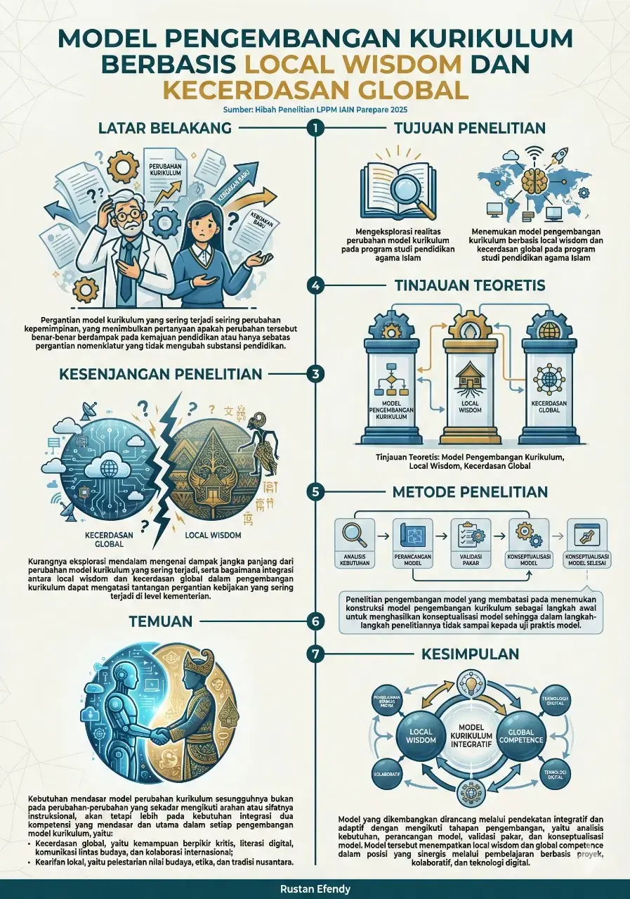 Dalam riset berjudul Model Pengembangan Kurikulum Berbasis Local Wisdom Dan Kecerdasan Global yang dilakukan oleh Rustan Efendy, Hamdanah, Muh. Ilham Jaya, Fakhriyah Nur Arfian Alinda Herman dan Nurul Al Ihram dari Institut Agama Islam Negeri (IAIN) Parepare, ditemukan bahwa perubahan kurikulum di Program Studi Pendidikan Agama Islam (PAI) selama periode 2018-2024 lebih bersifat politis dan aksidental, alih-alih didasarkan pada kebutuhan substantif pengembangan kompetensi. Temuan ini menyoroti urgensi untuk merancang model kurikulum yang lebih stabil dan berkelanjutan, berakar pada budaya lokal namun berwawasan global.