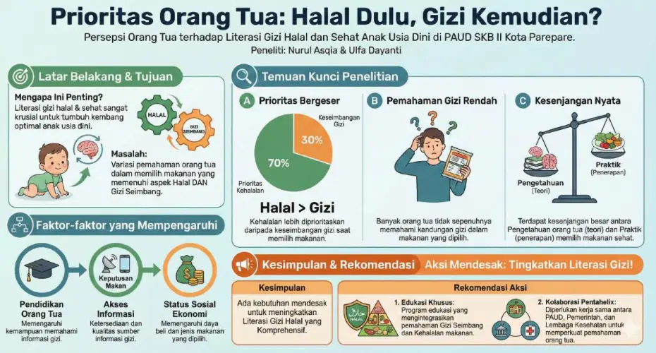 Dalam riset berjudul “Persepsi Orang Tua Terhadap Literasi Gizi Halal Dan Sehat Anak Usia Dini Di Kota Parepare” yang dilakukan oleh Nurul Asqia dan Ulfa Dayanti dari IAIN Parepare, terungkap bahwa pemahaman orang tua mengenai literasi gizi halal dan sehat pada anak usia dini masih sangat bervariasi. Penelitian ini menyajikan gambaran menarik tentang bagaimana orang tua di PAUD SKB II Kota Parepare, Sulawesi Selatan, menavigasi tantangan ini, dengan implikasi penting bagi upaya edukasi gizi di masa depan.