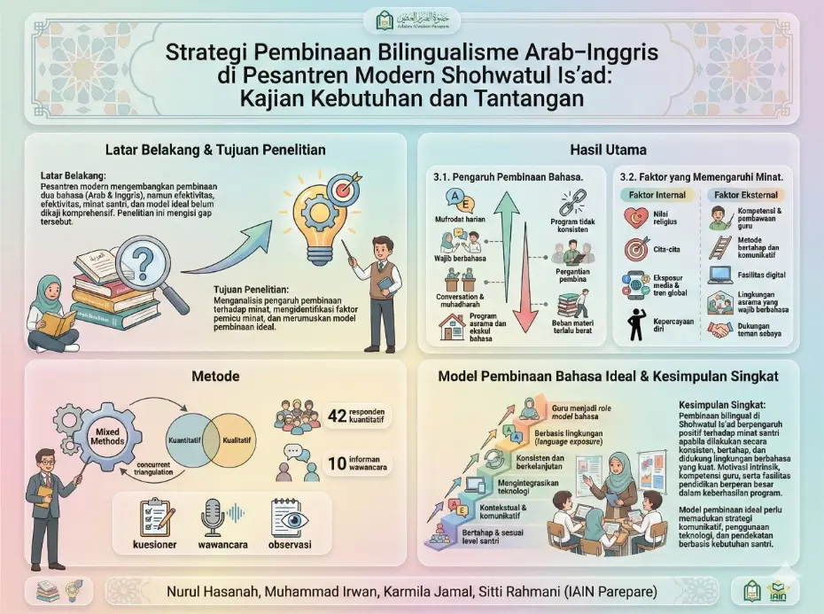 Dalam riset berjudul "Sociocultural Factors Shaping Learners' Interest in Arabic and English: A Mixed-Methods Study in a Bilingual Pesantren" yang dilakukan oleh Nurul Hasanah, Muhammad Irwan, Karmila Jamal, Siti Rahmani, dan Syahban Mada Ali dari Institut Agama Islam Negeri Parepare dan Institut Ilmu Sosial dan Bisnis Andi Sapada, terungkap sebuah pola yang mencolok. Penelitian ini menyoroti bagaimana faktor sosiokultural, pedagogis, dan identitas secara kolektif membentuk minat belajar bahasa pada santriwati, dan hasilnya menunjukkan bahwa minat terhadap bahasa Inggris secara konsisten lebih tinggi dibandingkan bahasa Arab.