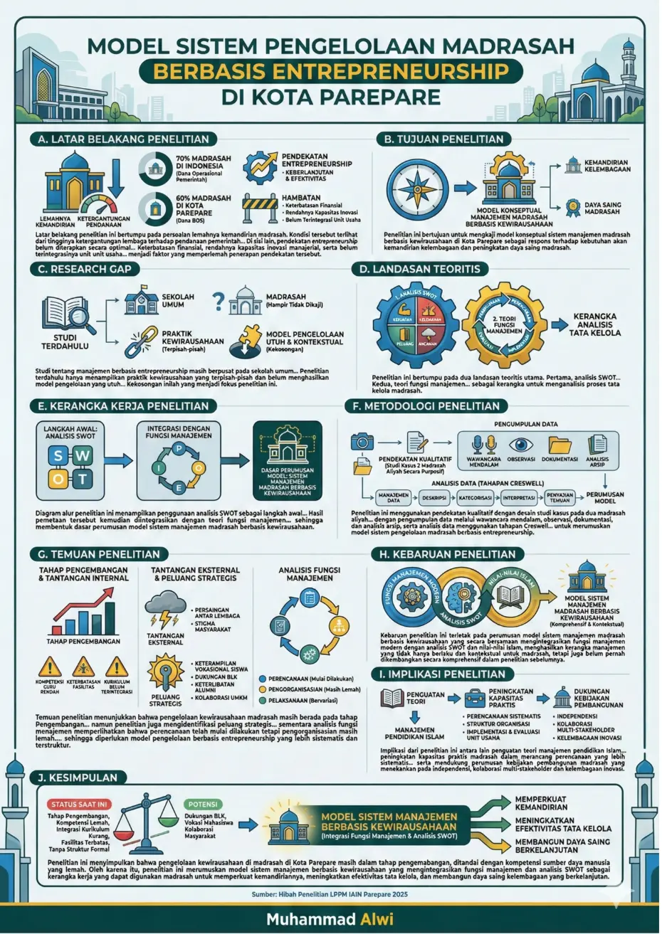 Dalam riset berjudul “MODEL SISTEM PENGELOLAAN MADRASAH BERBASIS ENTERPRENEURSHIP DI KOTA PAREPARE” yang dilakukan oleh Muhammad Alwi, Muh Iqbal Andhira, dan Muhammad Urwa, terungkap upaya strategis untuk merumuskan sistem pengelolaan madrasah berbasis kewirausahaan di Kota Parepare. Penelitian ini berupaya menjawab bagaimana madrasah dapat memperkuat kemandirian institusional dan inovasi dalam pendidikan Islam, berlandaskan nilai-nilai kejujuran dan keberkahan.
