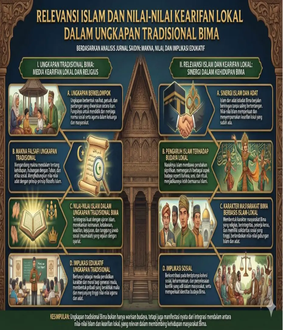 Akulturasi yang harmonis ini melahirkan “perkawinan budaya” yang memperkaya identitas Bima dengan nilai-nilai ketauhidan, moralitas, dan keadilan. Islam tidak hanya menjadi agama yang dianut, tetapi fondasi dalam seluruh aspek kehidupan sosial dan budaya masyarakat. Puncaknya terjadi pada masa Kesultanan Bima di abad XVII M, di mana Islam menjadi dasar penyelenggaraan pemerintahan, undang-undang, dan tatanan sosial kerajaan. Warisan ini terus hidup hingga kini, tercermin dalam adat istiadat, praktik keagamaan, arsitektur masjid, makam, rumah adat, dan tentu saja, ungkapan-ungkapan tradisional.