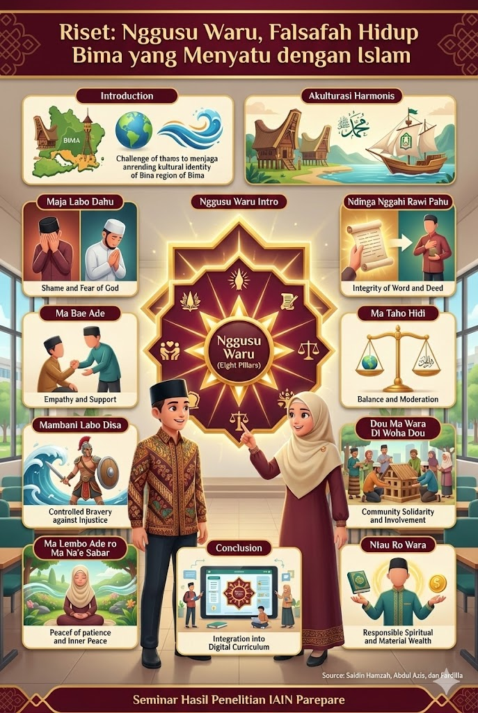 Dalam riset berjudul “Islam dan Budaya Lokal: Relevansi Nilai-nilai Kearifan Lokal dalam Ungkapan Tradisional Bima” yang dilakukan oleh Saidin Hamzah, Abdul Azis, dan Fardilla dari Institut Agama Islam Negeri Parepare, terungkap sebuah fenomena menarik. Studi ini menunjukkan bagaimana Islam dan budaya lokal Bima tidak berjalan secara terpisah, melainkan saling melengkapi dalam membentuk etika sosial, spiritual, dan budaya yang tercermin nyata dalam kehidupan sehari-hari masyarakat Bima. Peneliti menemukan bahwa ungkapan-ungkapan tradisional masyarakat Bima, yang dikenal sebagai Nggusu Waru, berfungsi sebagai pedoman hidup yang sarat nilai moral, spiritual, dan sosial, sekaligus memperkuat identitas keislaman dan harmoni sosial di komunitas tersebut.
