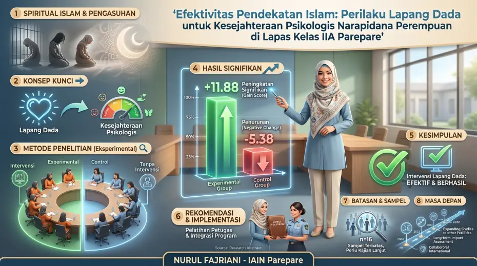 Dalam riset berjudul Pelatihan Lapang Dada Berbasis Nilai Islam untuk Meningkatkan Kesejahteraan Psikologis Narapidana Perempuan yang dilakukan oleh Nurul Fajriani dan Adelia dari IAIN Parepare, sebuah pendekatan inovatif diuji untuk mengatasi tantangan ini. Penelitian ini menawarkan solusi berbasis spiritual yang berakar pada nilai-nilai Islam, yaitu konsep “lapang dada”, sebagai strategi efektif untuk meningkatkan kesejahteraan psikologis narapidana perempuan.