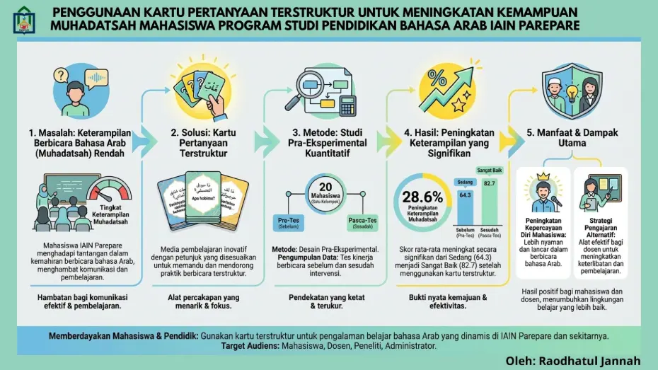 Dalam riset berjudul Peningkatan Keterampilan Muhadatsah Melalui Penggunaan Kartu Pertanyaan Terstruktur Dalam Pembelajaran Bahasa Arab yang dilakukan oleh Raodhatul Jannah, Rara Mutiah, dan Rahmatika dari IAIN Parepare, sebuah pendekatan inovatif diuji untuk mengatasi tantangan tersebut. Penelitian ini berupaya mengevaluasi efektivitas penggunaan kartu pertanyaan terstruktur sebagai media instruksional untuk meningkatkan keterampilan muhadatsah mahasiswa.